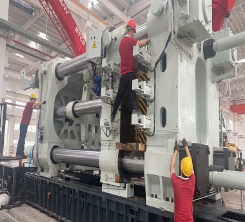 春興一號4000噸壓鑄機(jī)是春興目前擁有的最大噸位壓鑄機(jī),目前壓鑄機(jī)的組裝已經(jīng)初見雛形,一個(gè)龐然大物赫然佇立在新建成的壓鑄車間。截至發(fā)稿,力勁廠家的調(diào)試模具也已經(jīng)開始吊裝。由于正直酷暑,力勁廠家和春興現(xiàn)場工作人員冒著高溫,按照排好的安裝計(jì)劃緊鑼密鼓地加緊安裝,春興方的配合人員在保障好現(xiàn)場安裝需要的同時(shí),也積極準(zhǔn)備壓鑄機(jī)調(diào)機(jī)所用的物資,力爭早日安裝好進(jìn)入調(diào)試階段。